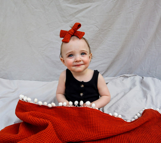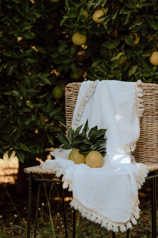 Wanderlust collection: Muslin swaddle with natural fringe detail.